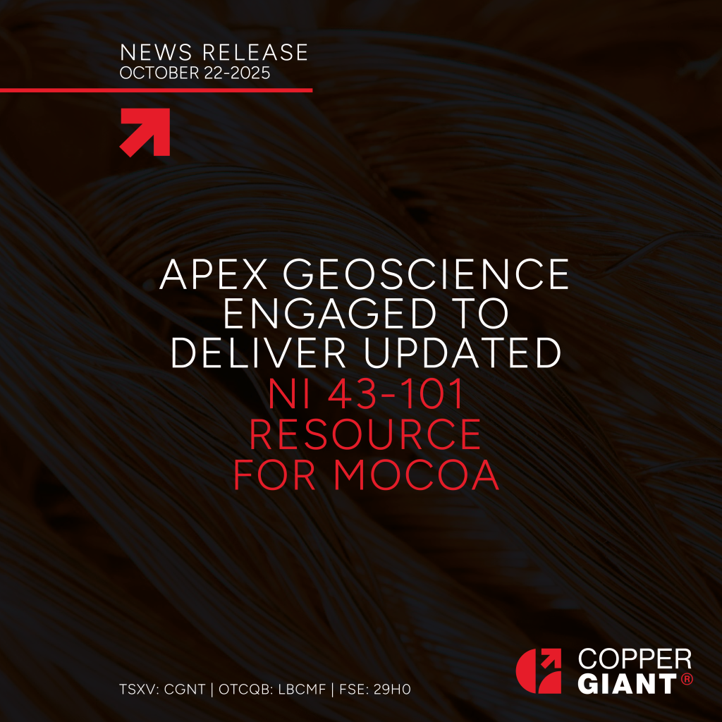 Vancouver, British Columbia – October 22, 2025 – Copper Giant Resources Corp. (“Copper Giant” or the “Company”) (TSXV: CGNT, OTCQB: LBCMF, FRA: 29H0) announces it has engaged APEX Geoscience Ltd., an independent geological consulting firm, to prepare an updated NI