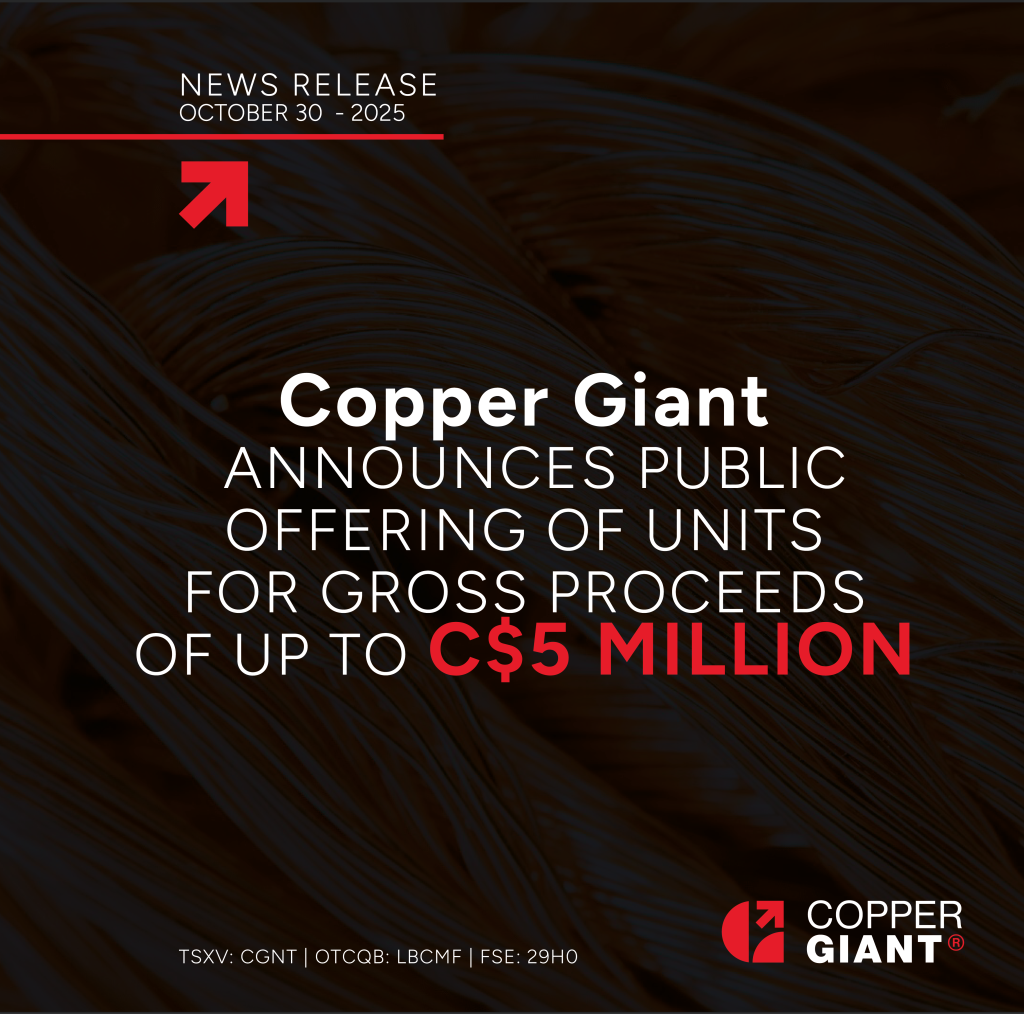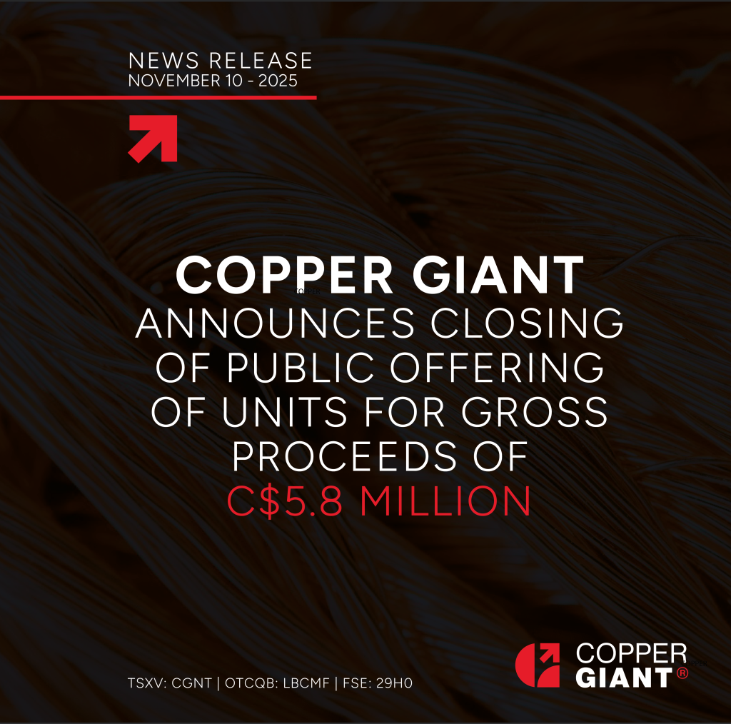 VANCOUVER, BC, Nov. 10, 2025 /CNW/ – Copper Giant Resources Corp. (“Copper Giant” or the “Company“) (TSXV: CGNT) (OTCQB: LBCMF) is pleased to announce the closing of its previously announced “best efforts” public offering (the “Offering“) for gross proceeds of C$5,750,276, which includes