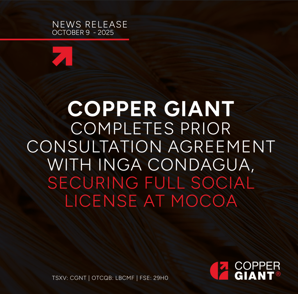Vancouver, British Columbia – October 9, 2025 – Copper Giant Resources Corp. (“Copper Giant” or the “Company”) (TSXV: CGNT, OTCQB: LBCMF, FRA: 29H0) is pleased to announce the successful completion of the Prior Consultation (“Consulta Previa”) process with the Inga