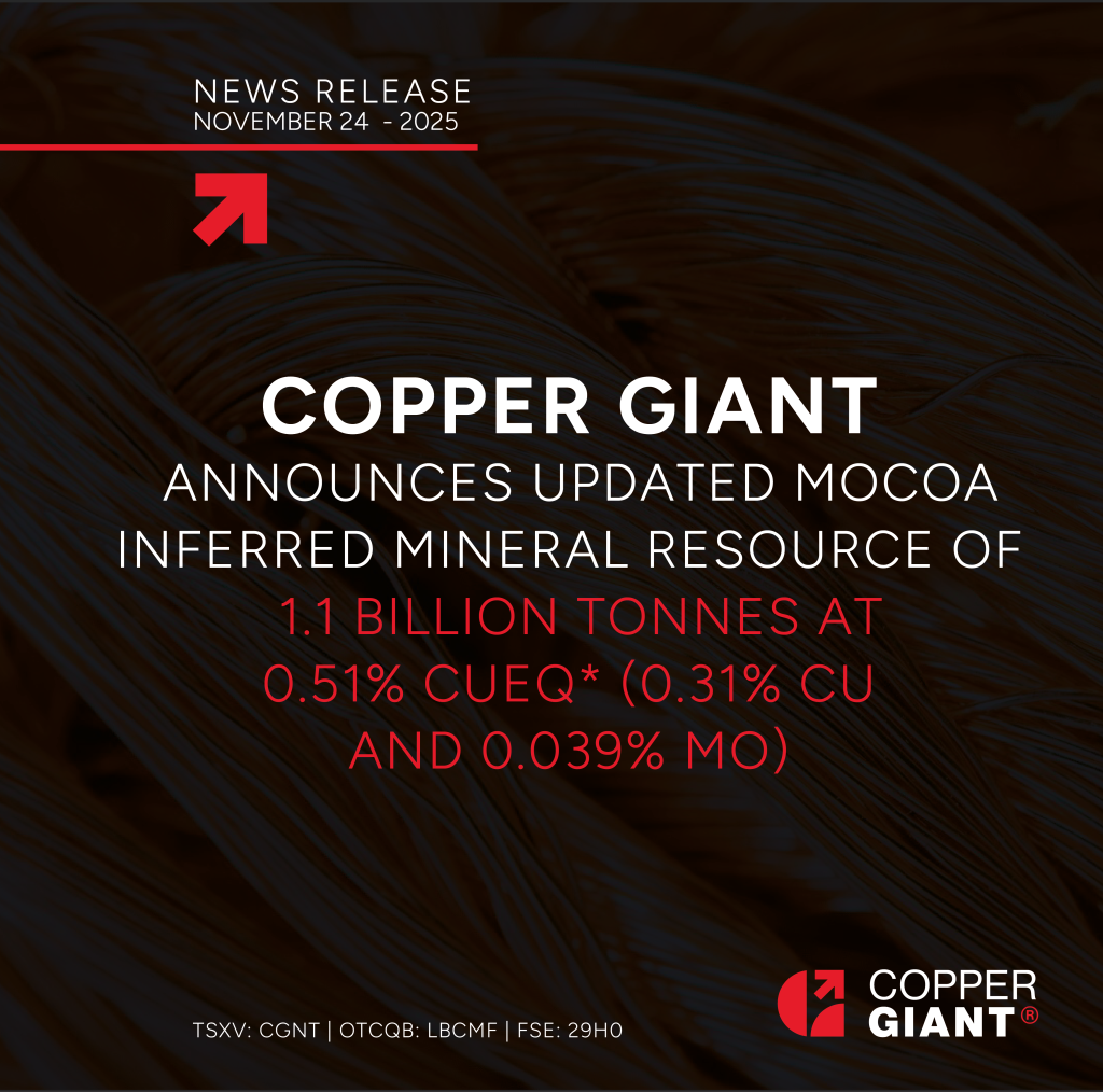Vancouver, British Columbia – November 24, 2025 – Copper Giant Resources Corp. (“Copper Giant” or the “Company”) (TSXV: CGNT, OTCQB: LBCMF, FRA: 29H0) announces an updated Mineral Resource Estimate (“MRE”) for its 100%-owned Mocoa copper-molybdenum porphyry project in southern Colombia.