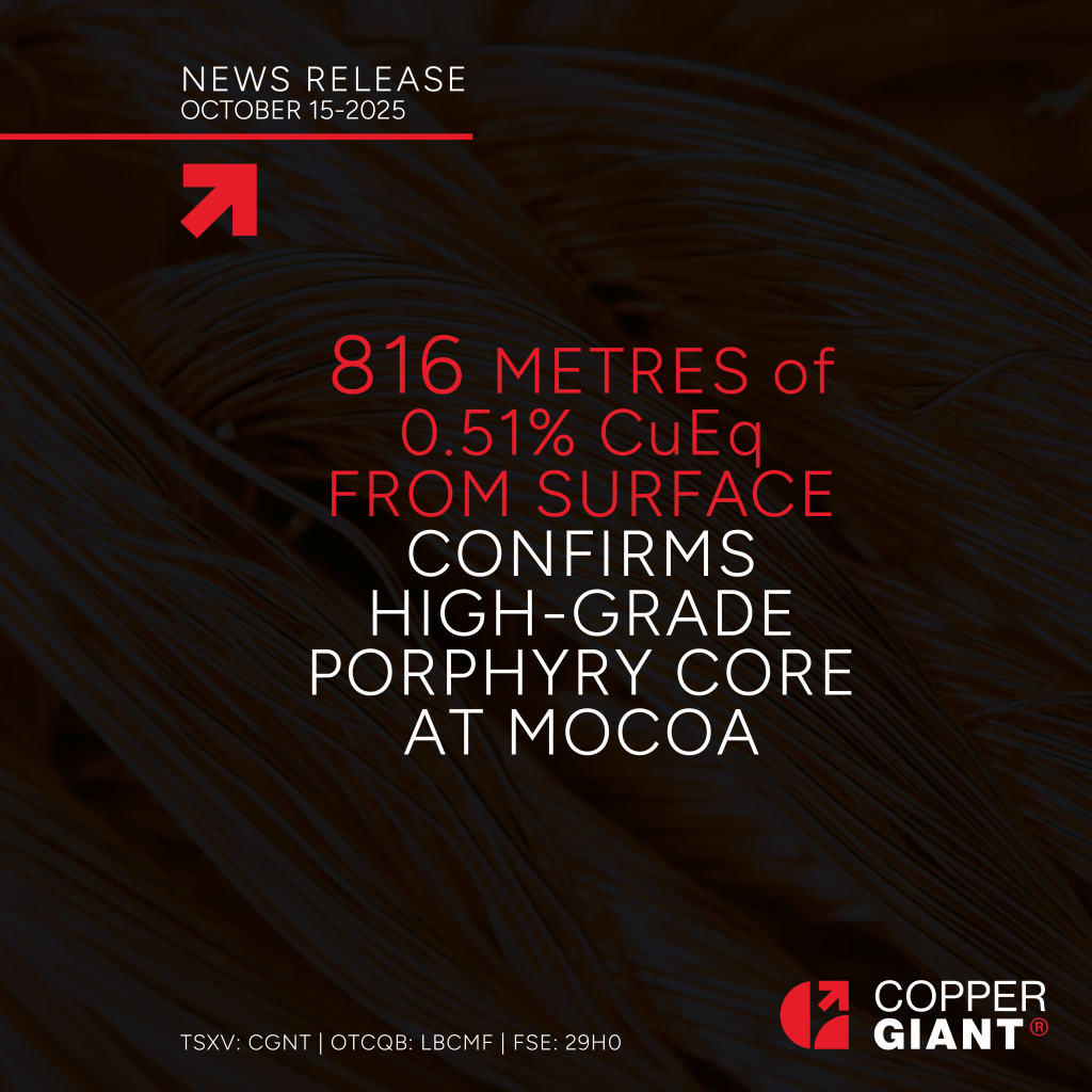 Vancouver, British Columbia – October 15, 2025 – Copper Giant Resources Corp. (“Copper Giant” or the “Company”) (TSXV: CGNT, OTCQB: LBCMF, FRA: 29H0) is pleased to report assay results from drill hole MD-051, successfully expanding the porphyry-related high-grade core eastward