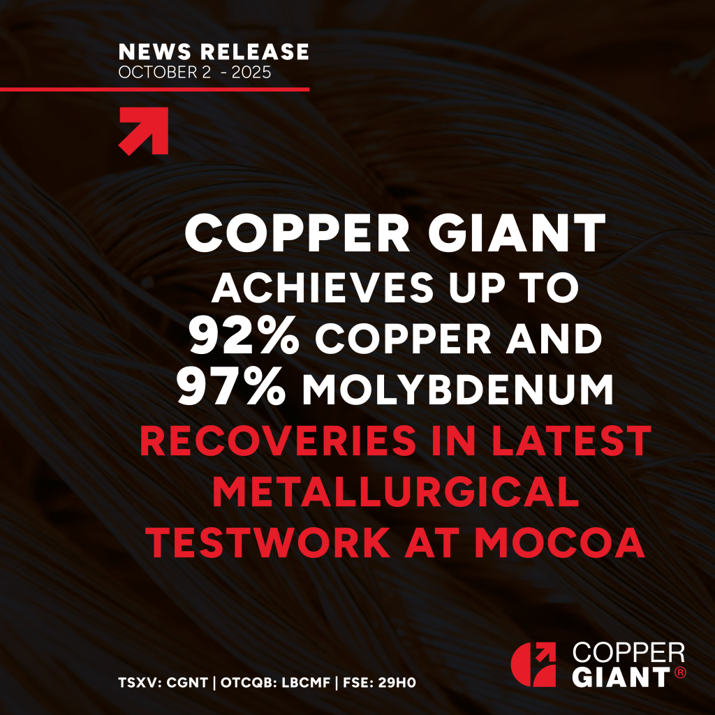 Vancouver, British Columbia – October 2, 2025 – Copper Giant Resources Corp. (“Copper Giant” or the “Company”) (TSXV: CGNT, OTCQB: LBCMF, FRA: 29H0) announces results from its bench-scale, preliminary metallurgical test work on core from the Mocoa copper-molybdenum project.