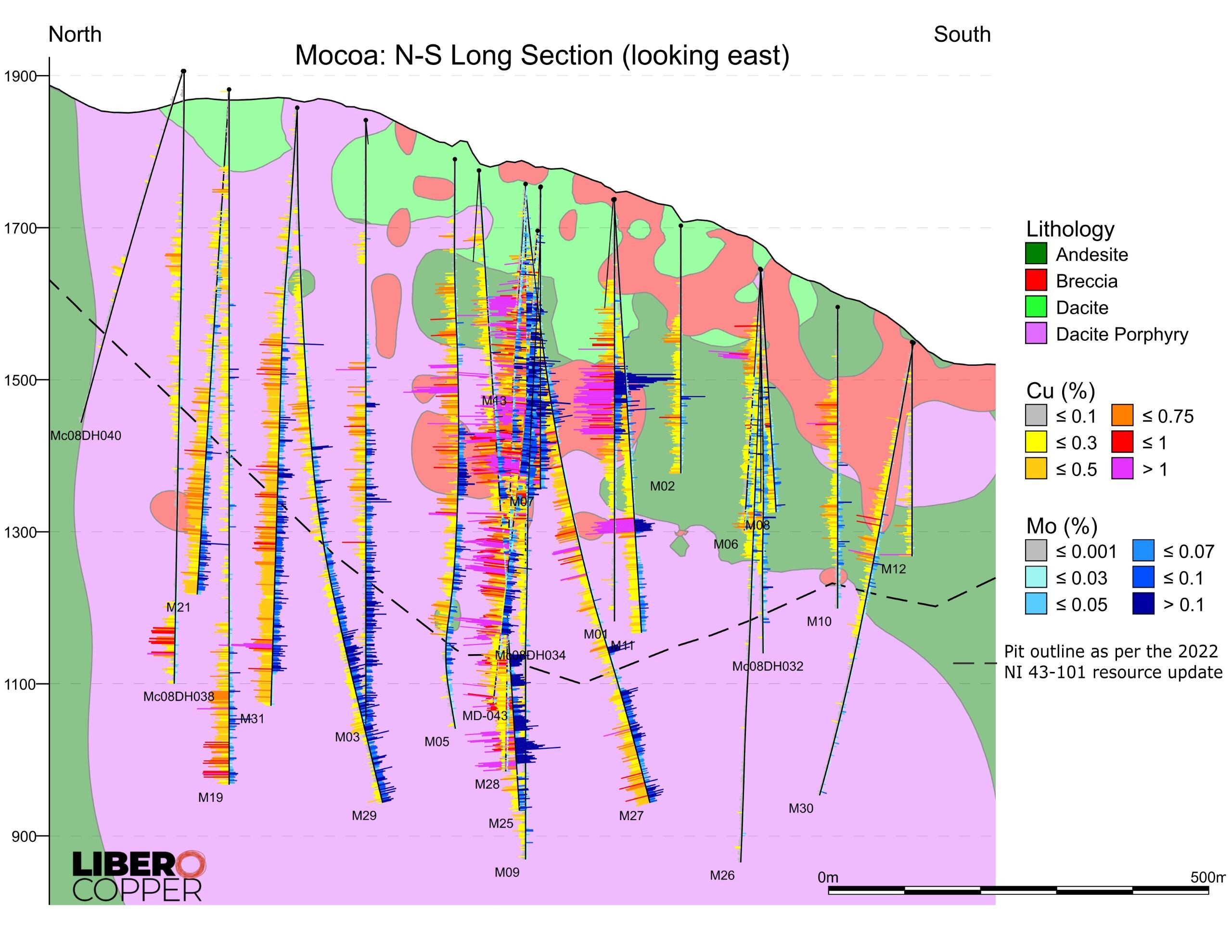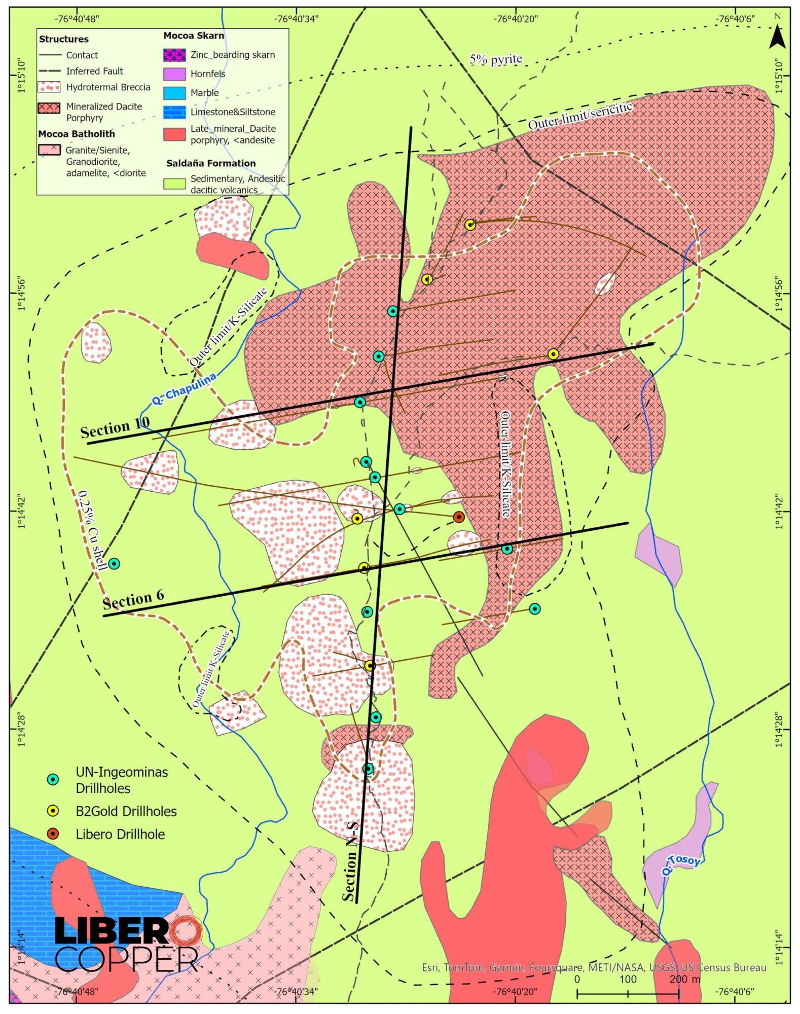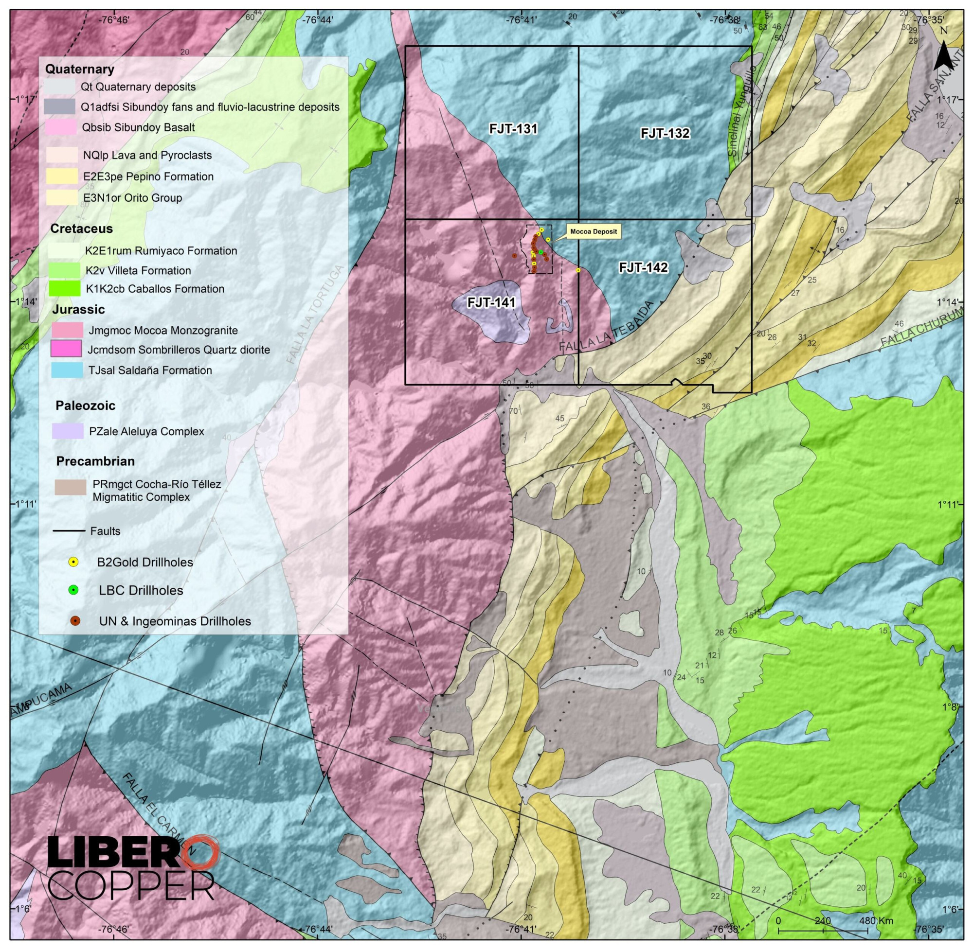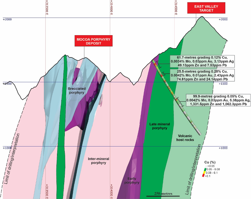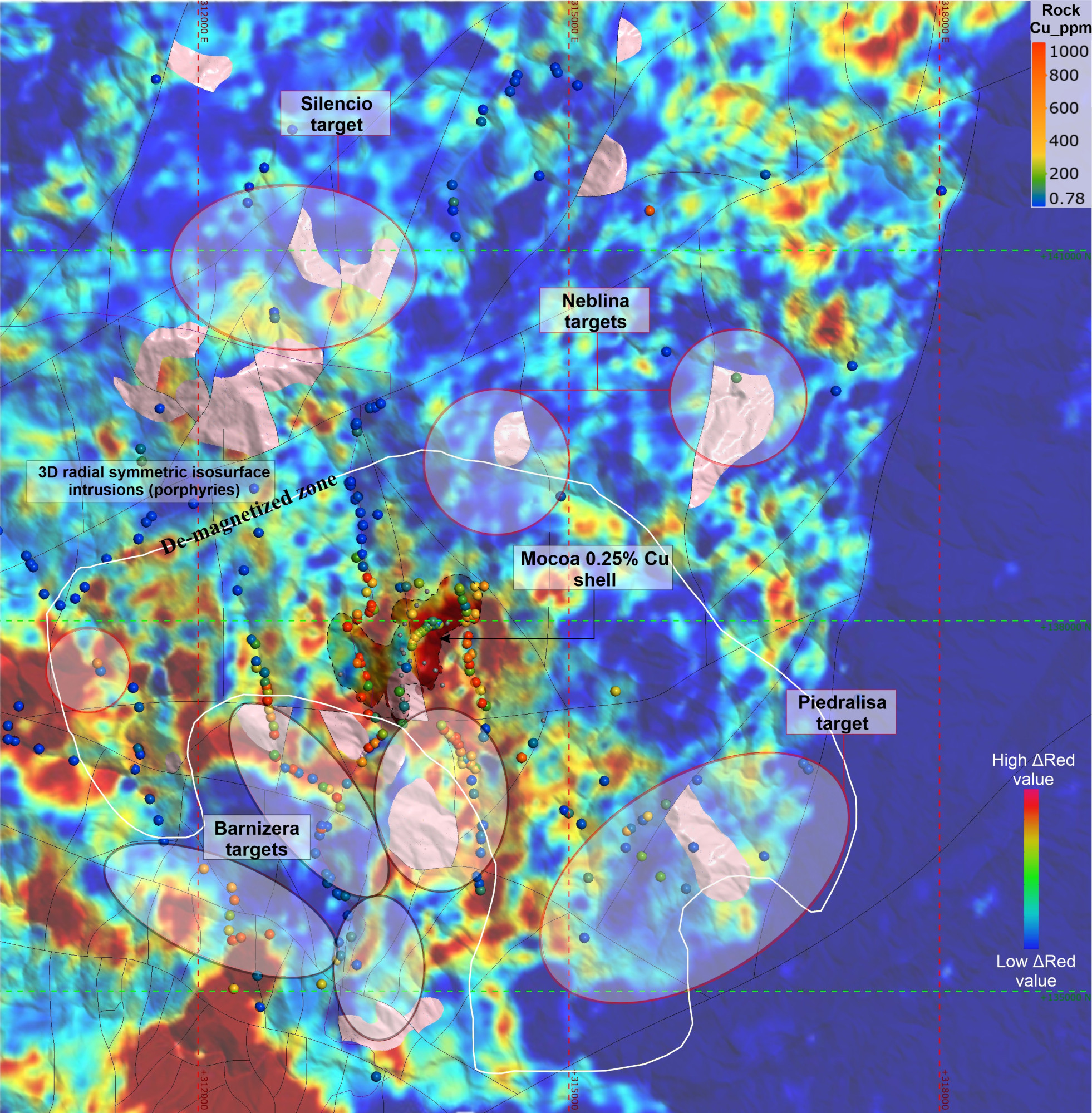 (1) Located 1,000 meters south of the center of the Mocoa deposit and associated with a 3D radial symmetric isosurface intrusion (porphyry) with elevated surface Cu-Mo in rock sample geochemistry immediately south of Mocoa, with strong K-alteration