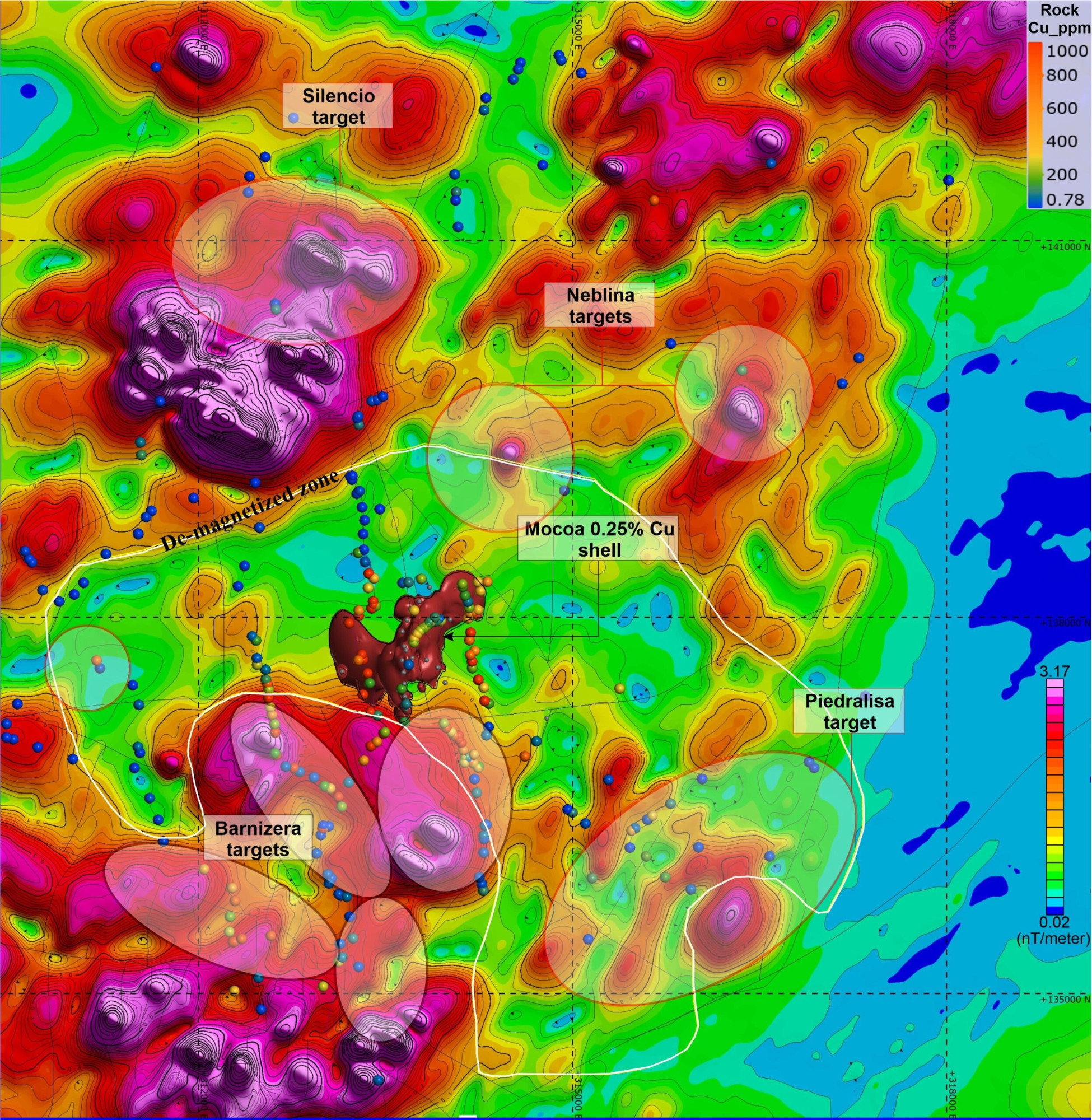 This area has two areas of high potential, located 2,000 meters northeast of the Mocoa deposit, associated with a 3D radial symmetric isosurface intrusion (porphyry) with locally elevated Cu in rock samples and moderate K-alteration.